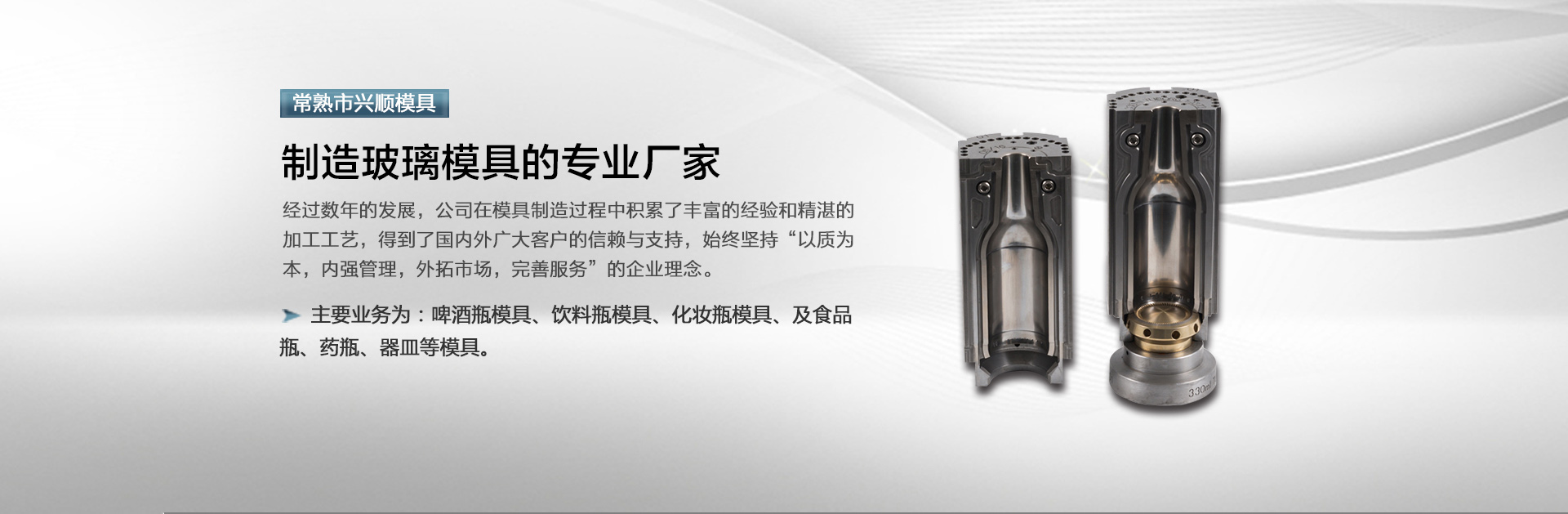 常熟市興順模具有限公司位于中國(guó)玻璃模具之鄉(xiāng)——江蘇常熟沙家浜,是一家制造玻璃模具的廠家。公司成立于1992年,主要業(yè)務(wù)為:啤酒瓶模具、飲料瓶模具、化妝瓶模具、及食品瓶、藥瓶、器皿等模具。我們擁有23年的模具制造經(jīng)驗(yàn),目前公司擁有員工100多人,我們公司目前主要出口到印度,西班牙,意大利,俄羅斯,越南,泰國(guó)等等。公司目前裝備有50多臺(tái)CNC車床和雕銑設(shè)備,一些是從日本引進(jìn)的小巨人,還有德國(guó)的德瑪吉,我們有自己的鑄造車間來保證模具材料的穩(wěn)定性。